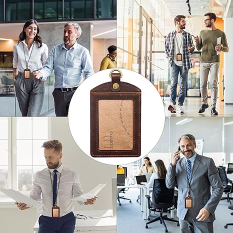 Badge Holder: Boshiho Cowhide Leather ID Badge Card Holder with 19" Neck Lanyard, Vertical Style