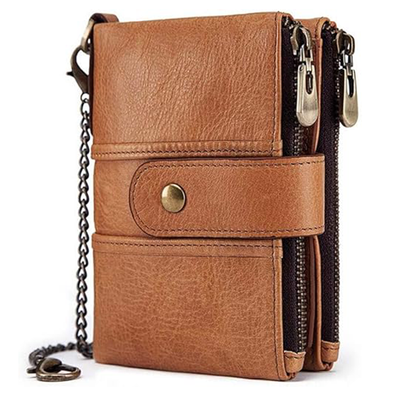 boshiho Real Leather RFID Blocking Bifold Wallets for Men Double Zipper Coin Pocket Purse with Anti-Theft Chain