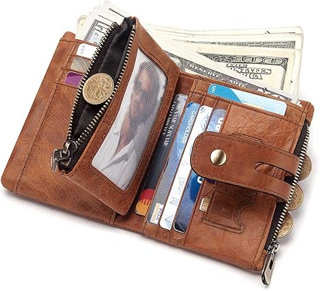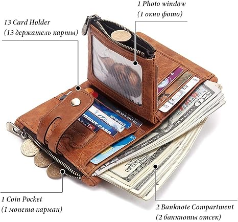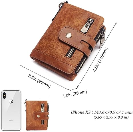 - π RFID Blacking and Anti-Theft Chain---The bifold wallet is made with the RFID Blocking material, prevent your data from unauthorized scanning. And Anti-Theft Chain also keep the wallet safe or prevent loosing when shopping, cycling or hiking.