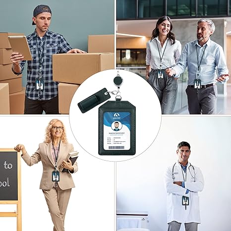 Office Badge Holder - Boshiho Genuine Leather Credit ID Card Holder with Stretch Neck Lanyard Vertical Style