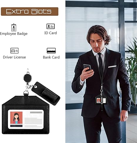 Office Badge Holder - Boshiho Genuine Leather Credit ID Card Holder with Stretch Neck Lanyard Horizontal Style